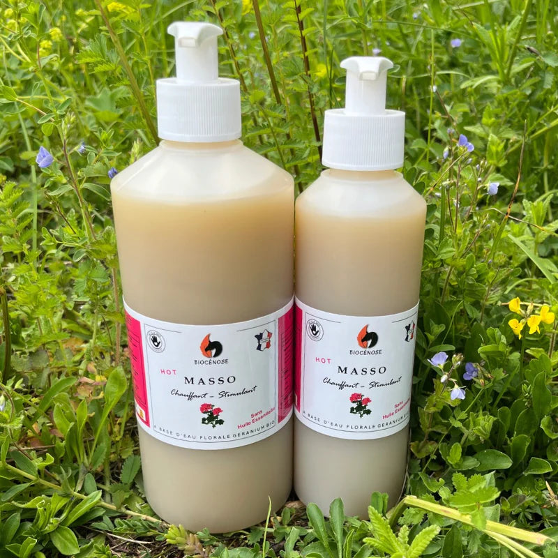 Gel massant chauffant à l'huile essentielle de poivre noir et eau florale de géranium permet de préparer les muscles avant le travail ou détendre après la séance